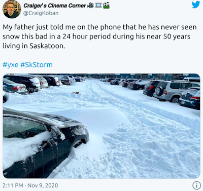Kindersley, Saskatchewan received an accumulative total of 47.6 cm (1.56 ft) of snow over the weekend, making it the city’s largest two-day snowfall in recorded history. Saturday alone saw 35.8 cm (1.2 ft), a reading that smashed the community’s all-time daily record of 21.3 cm (8.4 inches) set on March 17, 1974 (solar minimum of cycle 20)–note, that record is for any day of year, not just for November.