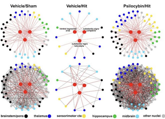 Functional Connectivity in rats receiving no head injury, or head injuries with or without psilocybin treatment. Reduced connectivity in numerous regions of the brain from mild repetitive brain injuries was reversed by the psilocybin treatment.